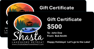 - Refunds: Gift Certificate purchases are non-refundable. Once issued, the value may only be applied toward stays at Shasta Lakeshore Retreat.