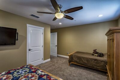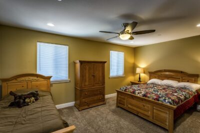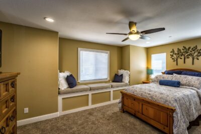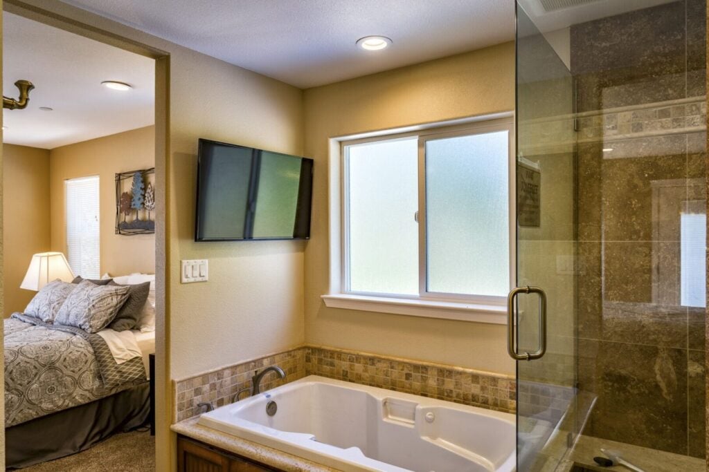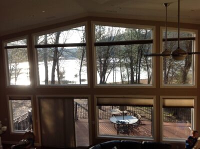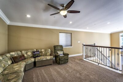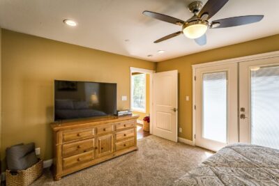 - Lots of seating, 65″ TV, Big Lake View Windows