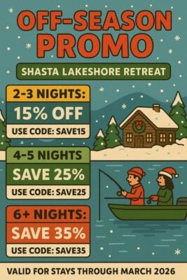 Shasta Lakeshore Retreat reserves the right to remove or change any special for any reason at any time.