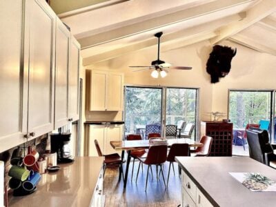 In addition to the home’s many features, this lakeview retreat has access to boat slips that’s available during the summer months from the neighboring marina for $55 per night (not part of Shasta Lakeshore Retreat). A variety of games and sitting areas make outdoor relaxation easy, and a ping pong table is an added bonus for those looking for a bit of competitive fun.